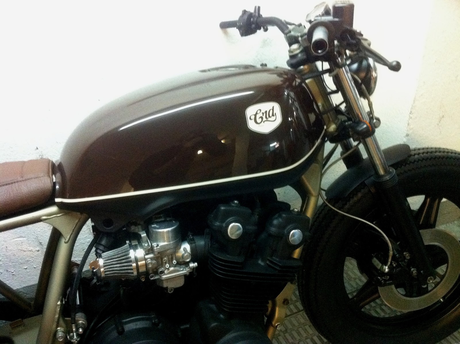 La CRD9 Cafe Racer ya tiene el asiento tapizado en color tabaco y su tanque luce un marrón chocolate combinado con el crema del logo y línea horizontal.
